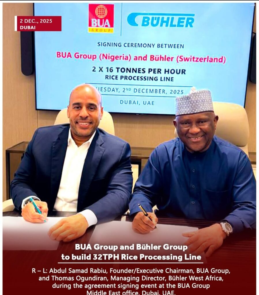 BUA Group has signed a major agreement with Bühler to develop a 32TPH rice processing line, strengthening Nigeria’s food security efforts and expanding the company’s agribusiness footprint