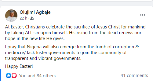 In his Easter message, Agbaje said the season gives Christians all over the world the privilege to celebrate the “sacrifice of Jesus Christ for mankind.”