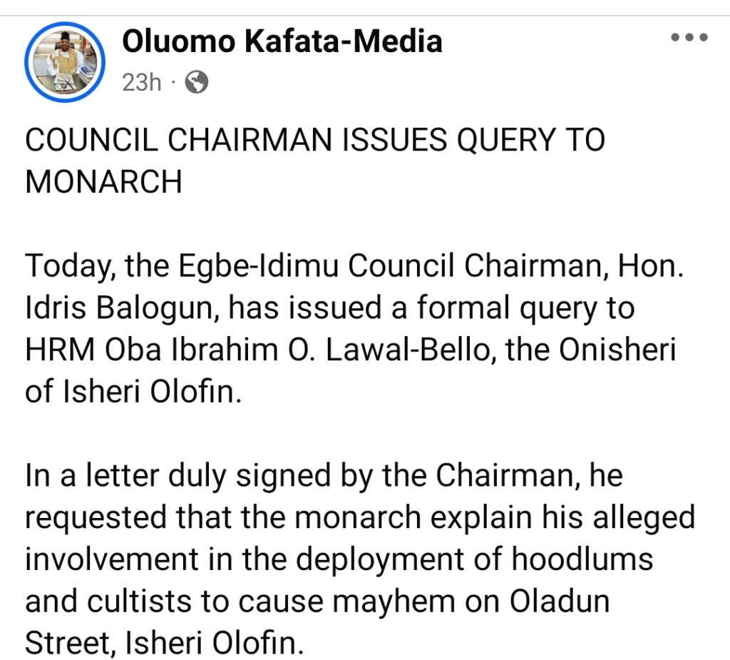 In a letter signed by the council chairman, the monarch was asked to clarify his alleged involvement in the deployment of hoodlums and cultists, who were said to have unleashed mayhem on Oladun Street, Isheri Olofin, during the unrest.