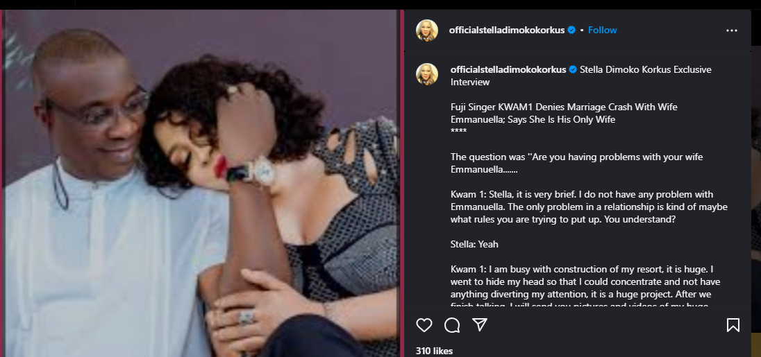 Responding to questions about an alleged rift in his marriage, KWAM1 was direct, “Stella, it is very brief. I do not have any problem with Emmanuella,” he said. “The only problem in a relationship is kind of maybe what rules you are trying to put up. You understand?”