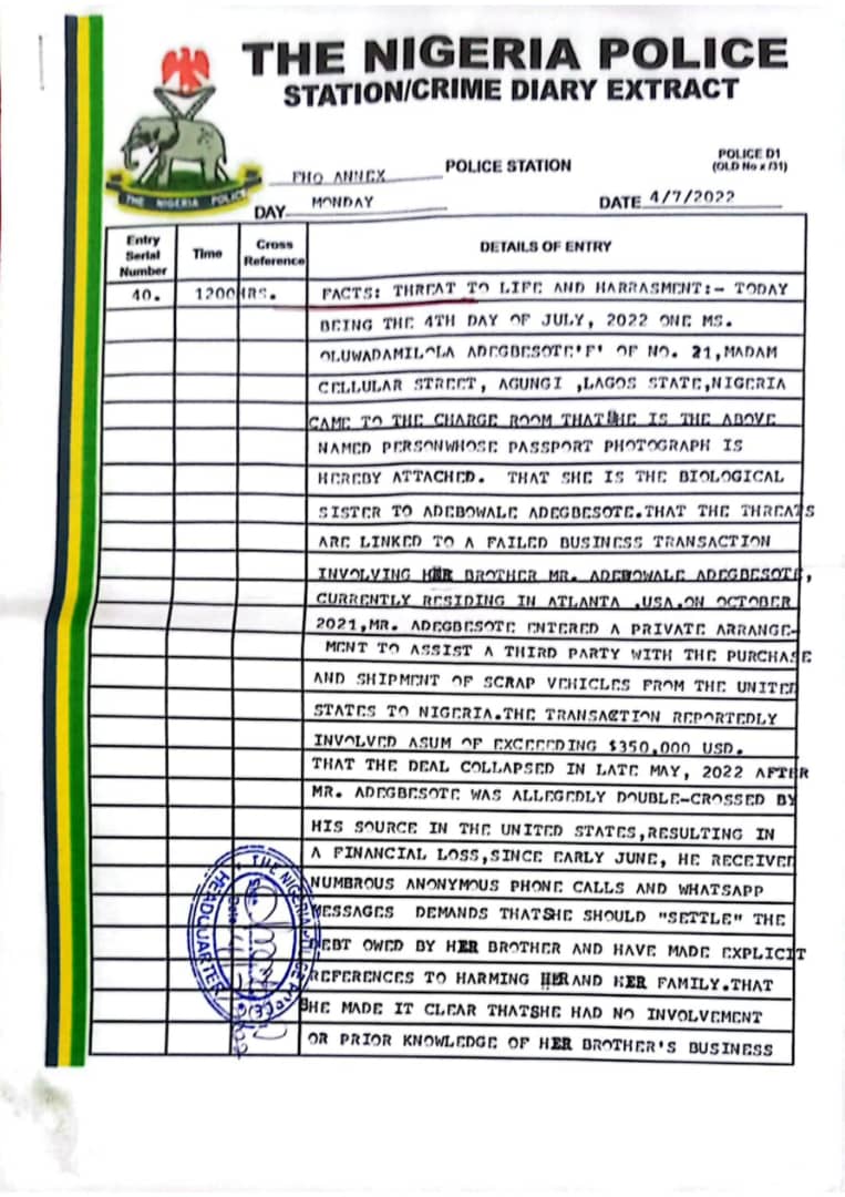 According to a sworn affidavit and supporting police report obtained by Newsheadline247, Mr. Adegbesote entered into an informal financial agreement to assist in the export of scrap vehicles from the United States to Nigeria.
