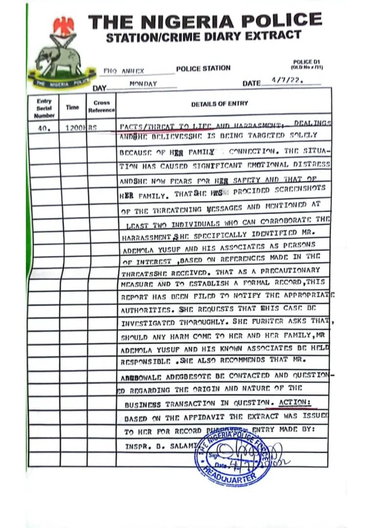 Mrs. Adegbesote has now filed a police report in Lagos and raised the alarm publicly. In herofficial statement, she expressed that she fears not just for herself, but for her brother, infantdaughter and husband.