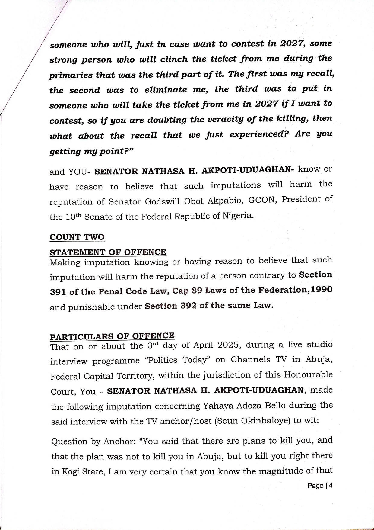 In a second count, the senator is accused of repeating similar claims about Yahaya Bello during the same program, stating:
