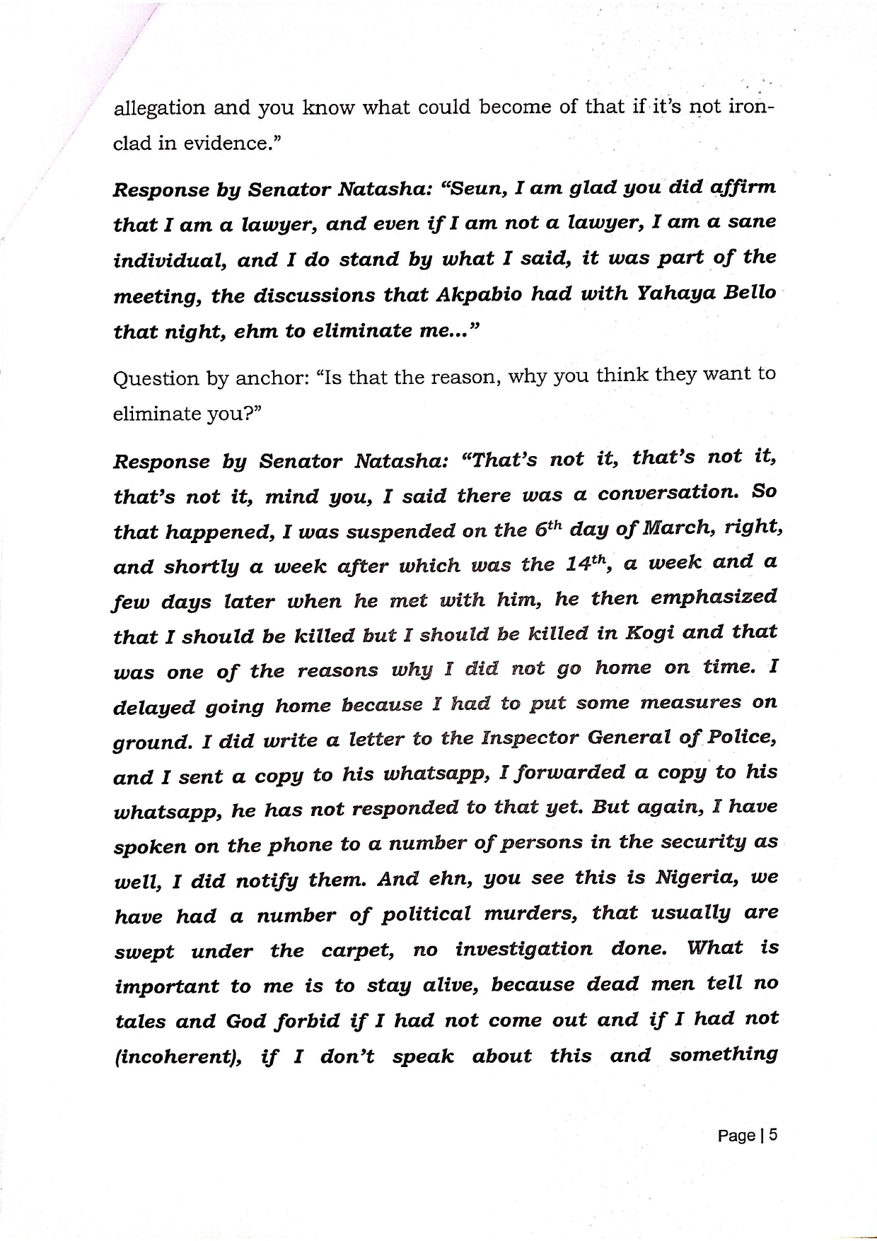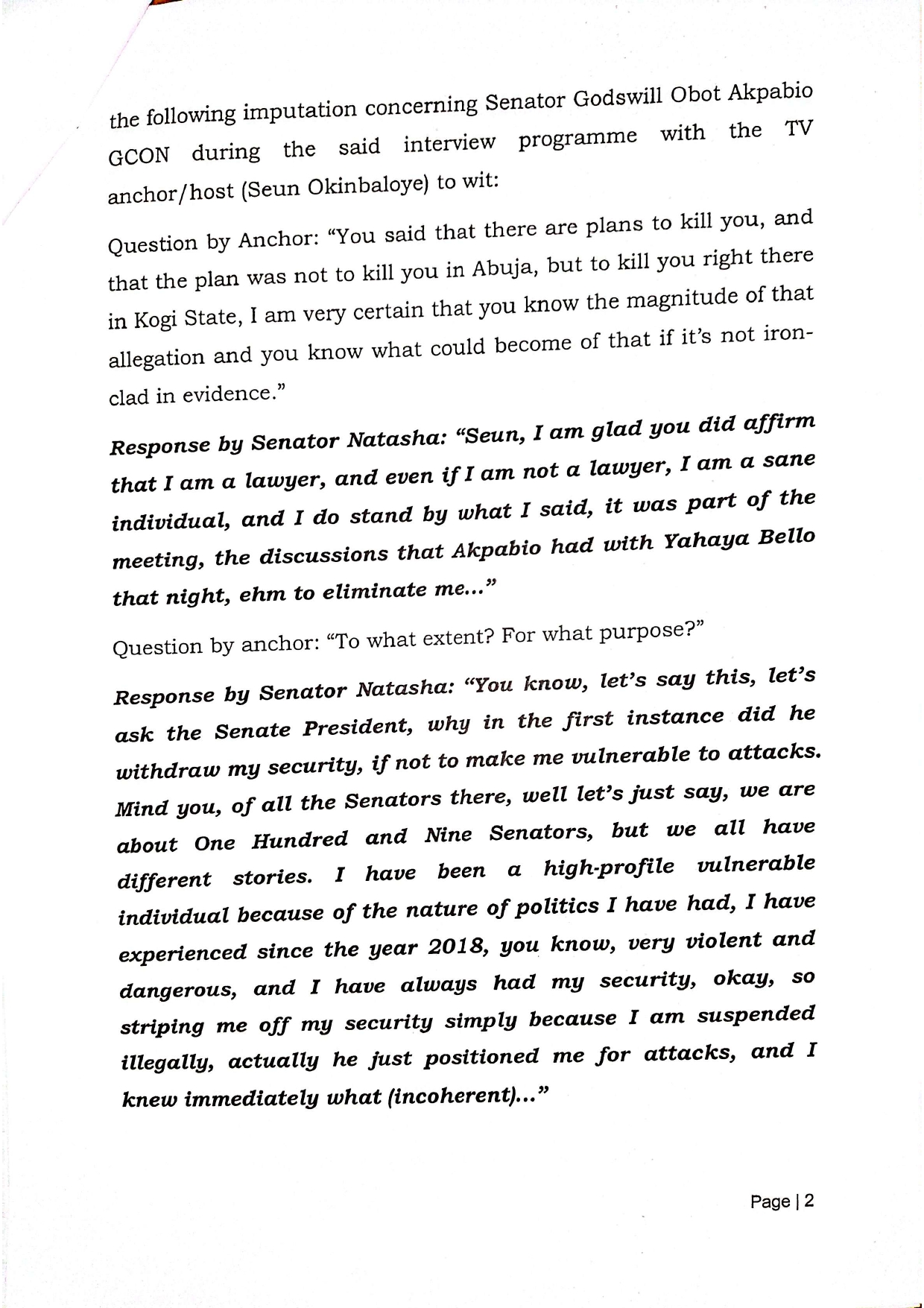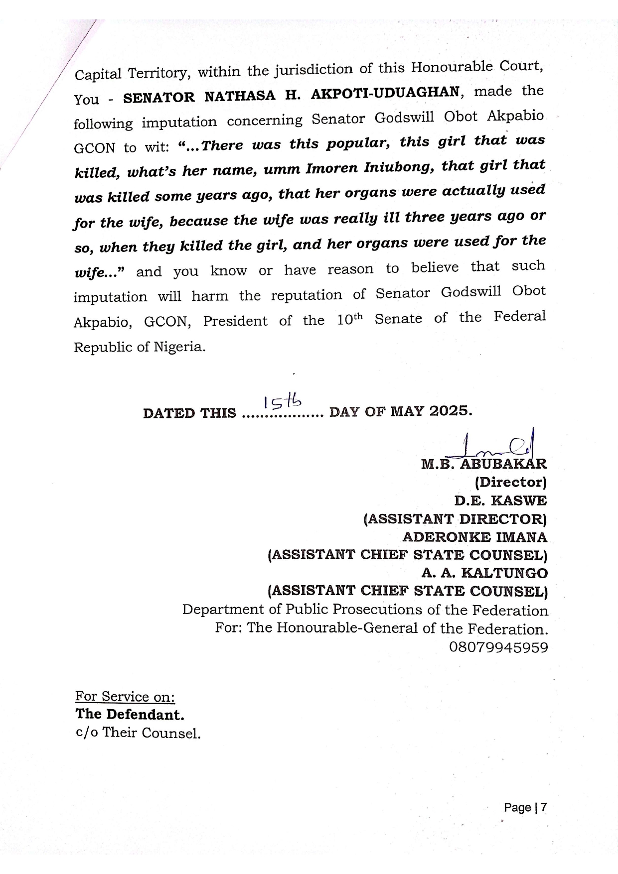According to the charge sheet, Akpoti-Uduaghan said: “It was part of the meeting, the discussions that Akpabio had with Yahaya Bello that night to eliminate me. Let’s ask the Senate President, why in the first instance did he withdraw my security, if not to make me vulnerable to attacks? He then emphasized that I should be killed, but I should be killed in Kogi.”