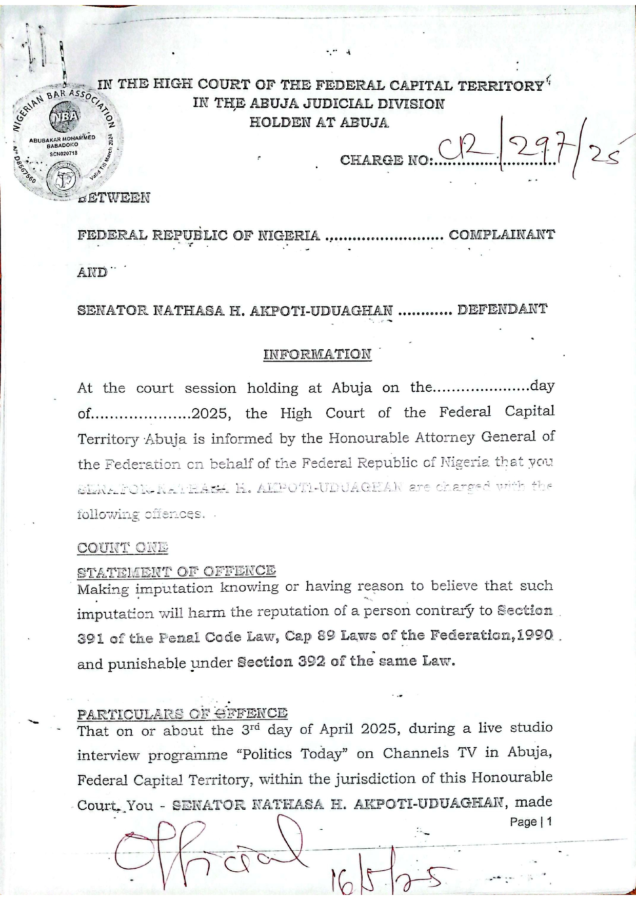 The government is accusing the senator of violating Section 391 of the Penal Code, Cap 89, Laws of the Federation, 1990, which criminalizes statements made with the knowledge or reasonable belief that such statements will harm the reputation of another person. The offence is punishable under Section 392 of the same code.