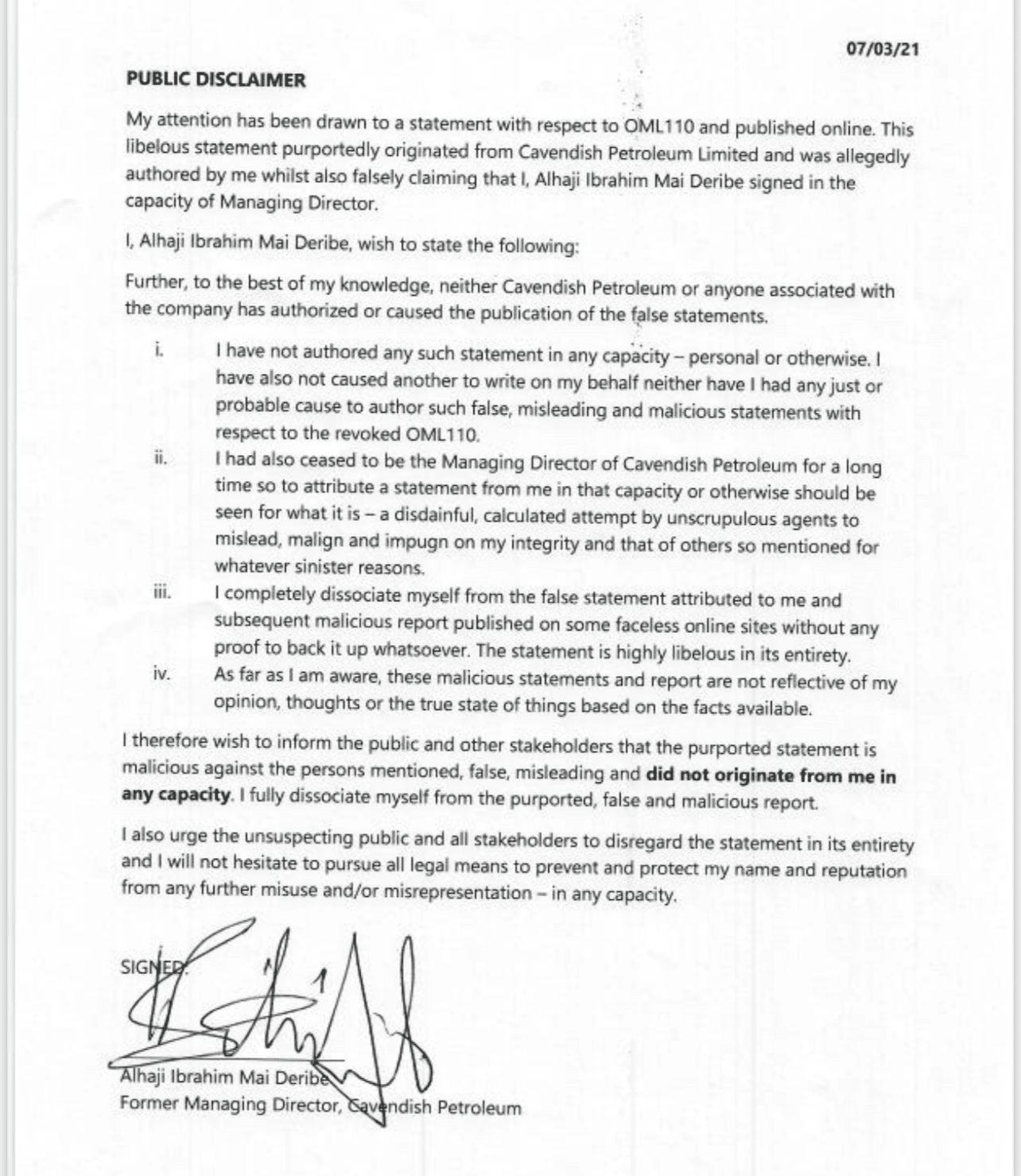“My attention has been drawn to a statement with respect to OML110 and published online. This libellous statement purportedly originated from Cavendish Petroleum Limited and was allegedly authored by me whilst also falsely claiming that I, Alhaji Ibrahim Mai Deribe signed in the capacity of Managing Director,” he said.