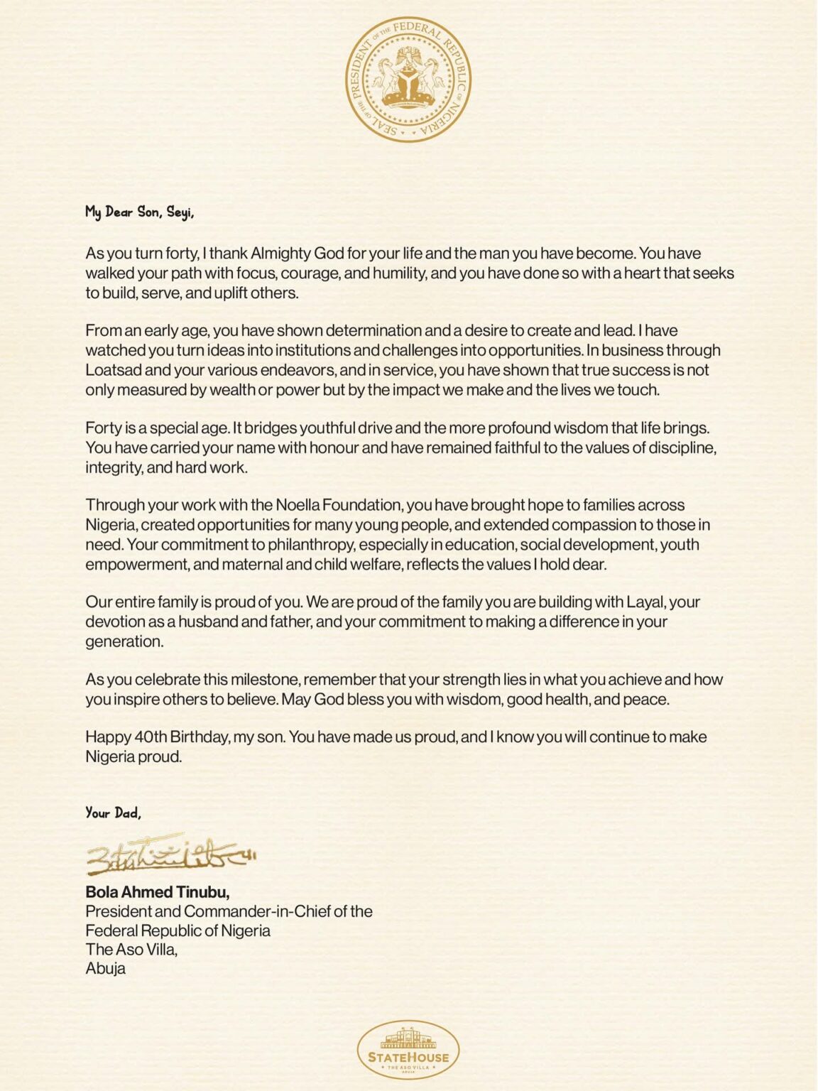 In a heartfelt open letter released on Monday, President Tinubu expressed profound gratitude to God for Seyi’s life, celebrating his son’s accomplishments, character, and growing legacy.