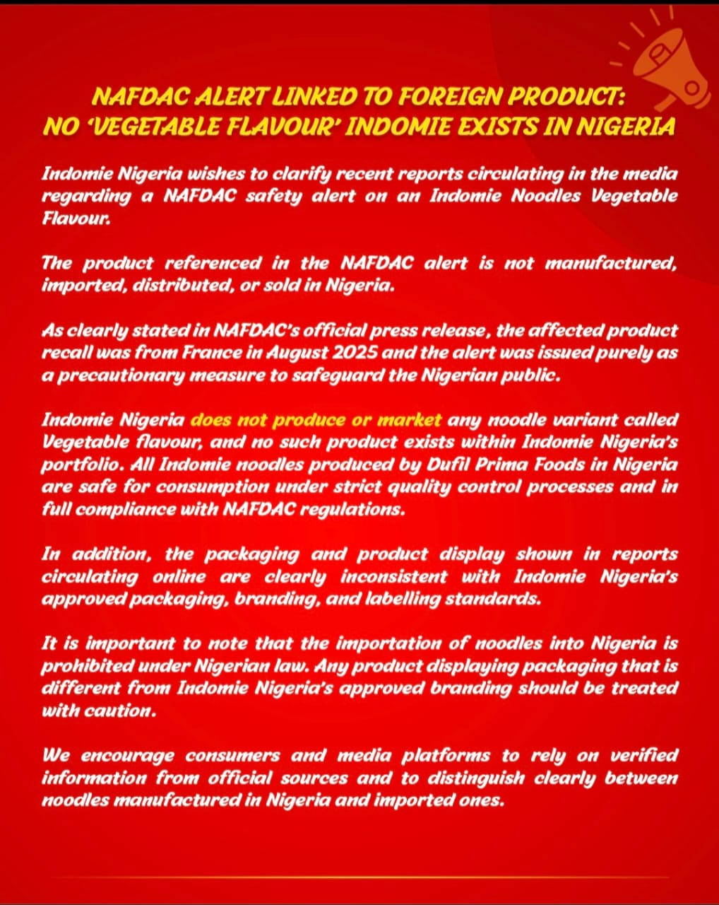 Indomie Nigeria has clarified that the ‘Vegetable Flavour’ noodles recalled by NAFDAC are not produced or sold in Nigeria, stressing the product is foreign and not part of its portfolio