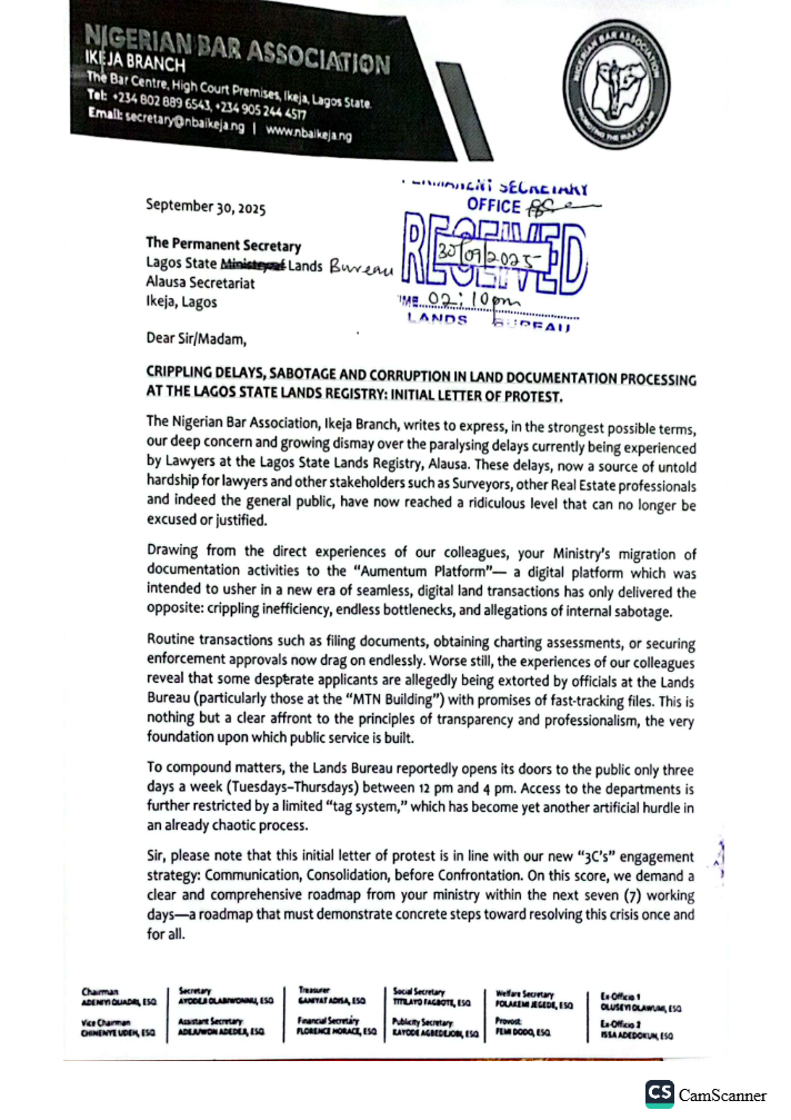 The Nigerian Bar Association (NBA), Ikeja Branch, has accused the Lagos State Lands Registry of crippling inefficiency, corruption, and sabotage, warning of protests if the government fails to act swiftly