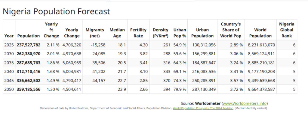 According to the latest United Nations data, as estimated by Worldometer, Nigeria’s population is projected to reach 237,527,782 by 2025. This marks an increase from the 235,072,214 recorded in December 2024.