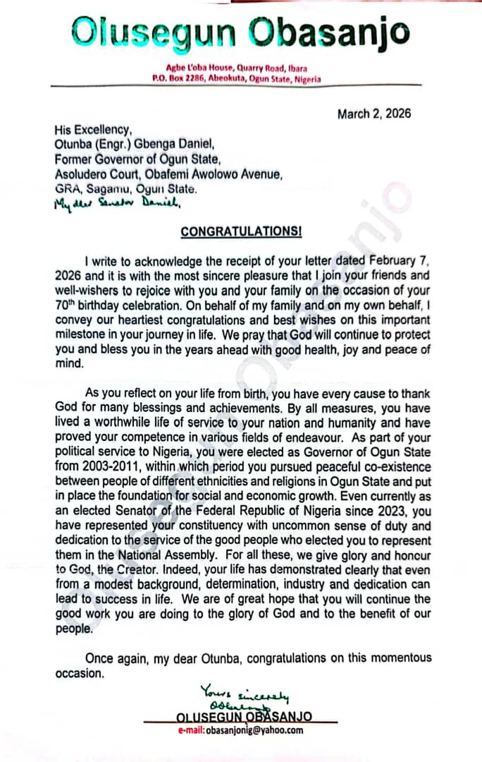 Former President Olusegun Obasanjo pens a heartfelt message to Senator Gbenga Daniel on his 70th birthday, praising his legacy, leadership, and dedication to Nigeria
