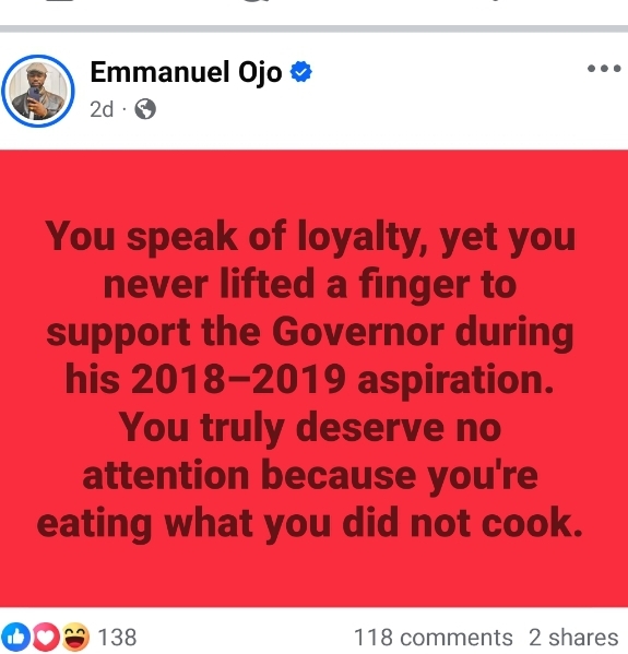 The outburst came amid growing pressure from Abiodun loyalists, some of whom have urged the governor to weed out perceived disloyal appointees. Earlier, Ojo had sparked controversy when he posted: “You speak of loyalty, yet you never lifted a finger to support the Governor during his 2018–2019 aspiration. You’re eating what you did not cook.”