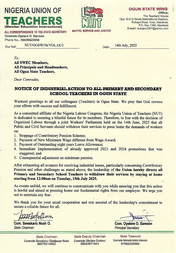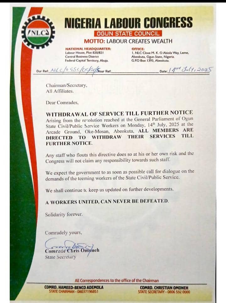 The strike, declared by the Organised Labour in Ogun State – comprising the Nigeria Labour Congress (NLC), Trade Union Congress (TUC), and Joint Negotiating Council (JNC) – took effect from midnight on Monday, July 15, bringing government operations at both state and local levels to a standstill.