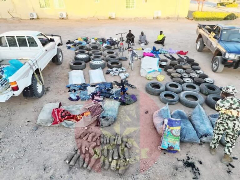 The seized items include two civilian vehicles, 31 spare tyres, 23 spare rims, two bicycles, 12 ignition key starters, three alternators, and two bags of flour. Other items recovered were one mattress, five bags of charcoal, 34 tubers of yam, two blankets, two nylons of garri, assorted adult and children’s clothing, one power bank, six mobile phones, and cash of various denominations.