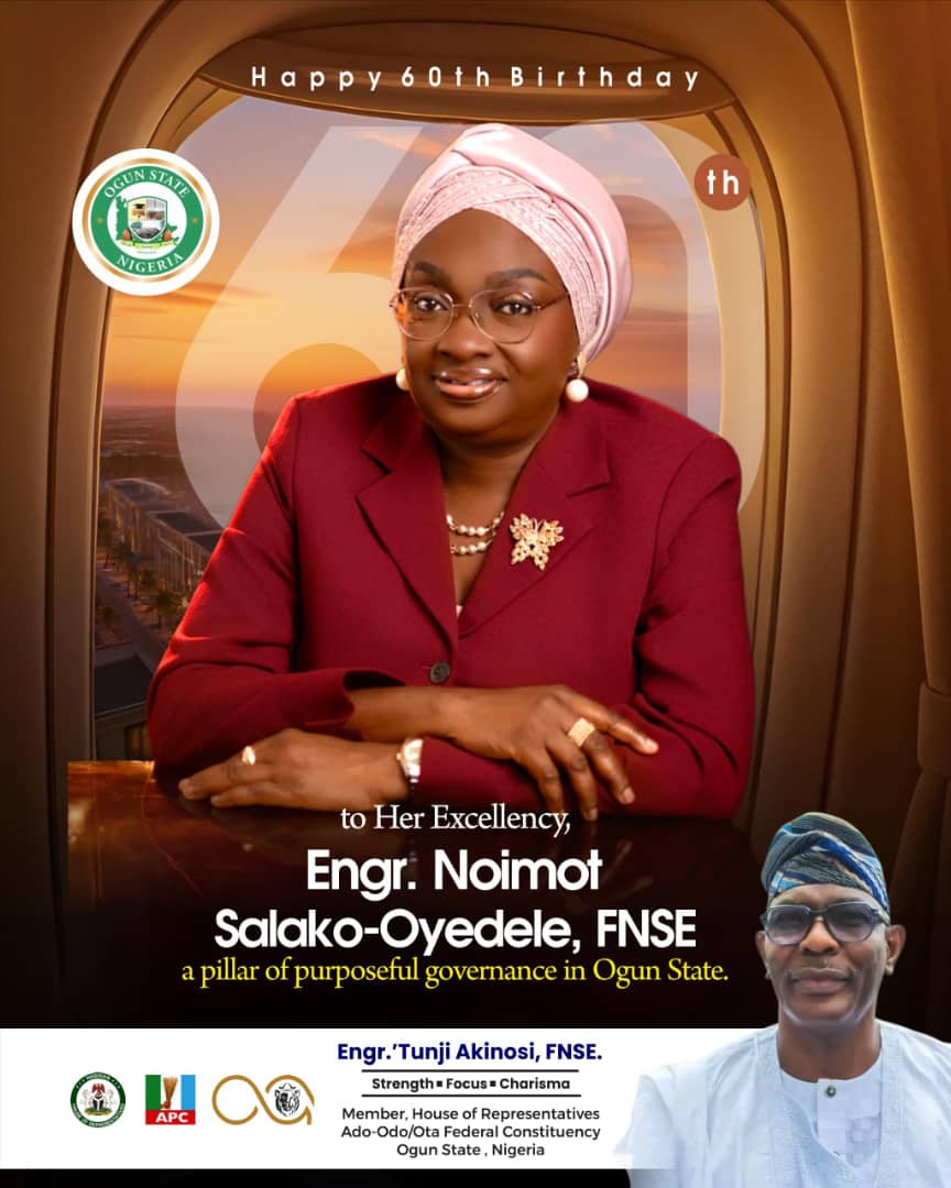 As Ogun State Deputy Governor, Her Excellency, Engr. Noimot Salako-Oyedele, FNSE, marks her birthday today, January 8, 2026, the lawmaker representing Ado-Odo/Ota Federal Constituency in the House of Representatives, Hon. Tunji Akinosi, FNSE, has led glowing tributes describing her as a shining example of disciplined, competent, and purpose-driven leadership.